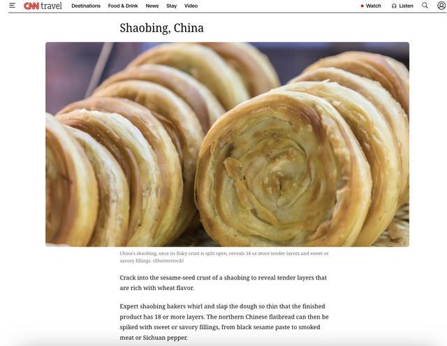 对于中国烧饼,榜单是这样介绍的:敲开撒满芝麻的烧饼外壳,便可看到柔软、层次丰富的内里,充满了麦香。专业的烧饼师傅通过旋转和拍打面团,使其变得极薄,最终成品能呈现出18层或更多的层次。这种中国北方的扁平面包可以加入甜口或咸口的馅料,从黑芝麻酱到熏肉,或是四川花椒,风味多样。
